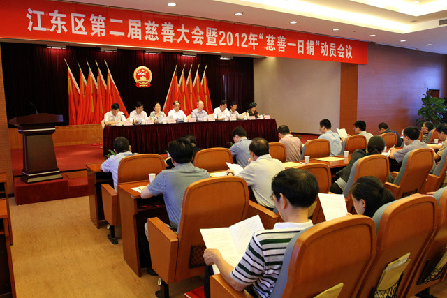 會議由區委常委、常務副區長李國宏主持,副區長丁丁作“慈善一日捐”動員部署。授予了史梅康等17人,東力控股集團有限公司、賽爾集團有限公司等28個機構,市第六醫院江東“白內障復明工程”等10個慈善項目以及江東區志愿者協會等10個志愿者集體和個人第二屆“江東慈善獎”榮譽稱號。部分獲獎機構和個人代表還交流了各自參與慈善事業的體會。市慈善總會會長陳云金、江東區委書記胡軍到會講話。