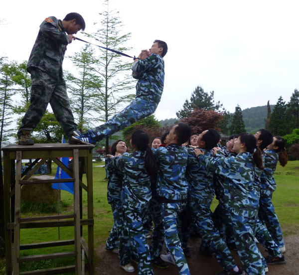 開班前,教練通過了一系列的歡快活動,把全體成員分為五隊(鷹之隊、屠龍隊、步步隊、牛哄哄隊、如意隊),參加了信任背摔、七巧板拼圖、盲人方陣、高空行走、接力傳遞球和凌空擊鼓等活動。經過激烈的比賽,強烈意識到:成功必須鍛煉意志和培養團隊協作的品德情操。如高空行走時每個成員必須膽大心細,敢于挑戰,相互鼓勵,戰勝恐懼;而凌空擊鼓講究的是同心協力,要有團隊協作精神、要有絕對服從的思想、要有顧全大局的理念。