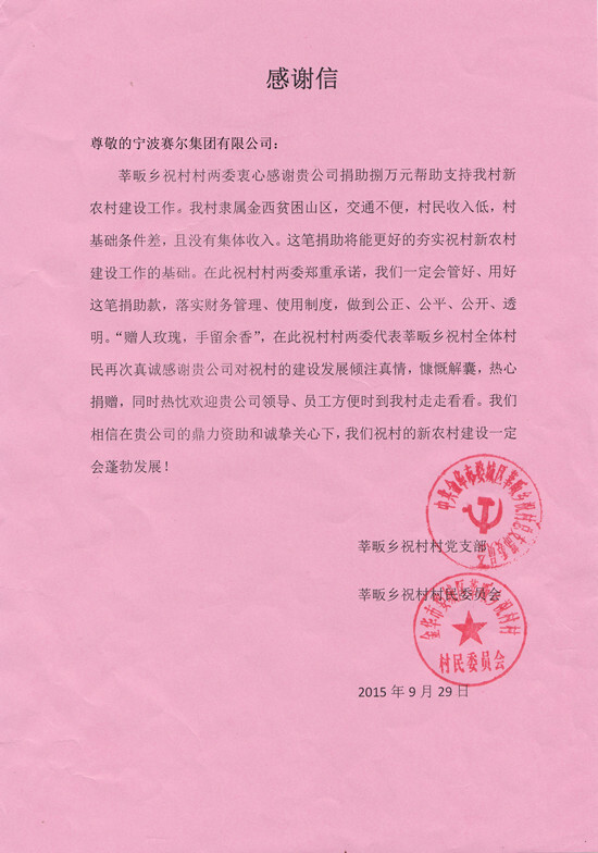 幫助祝村修路,只是近年來我集團(tuán)履行社會責(zé)任的一個側(cè)面,也是集團(tuán)“賽爾愛農(nóng)”慈善基金的最新項(xiàng)目,近年來,“賽爾愛農(nóng)”項(xiàng)目已捐助貴州、麗水、奉化等多地農(nóng)村的老年活動中心、希望小學(xué)、村級道路等多個基礎(chǔ)設(shè)施項(xiàng)目,累計捐款近400萬元。