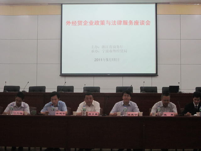 5月11日下午,省商務廳周日星副廳長帶領政策與法律服務團來我市召開了外經貿企業政策與法律服務座談會。省商務廳周日星副廳長、寧波市委組織部張良才副部長、省商務廳公平貿易局張勇局長等領導出席會議,會議由市外經貿局徐建華副局長主持。中基寧波集團、中化寧波公司、億泰控股集團、貝發集團等30余家企業參加了本次座談會。