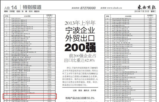 賽爾網訊 7月22日,寧波市外經貿局發布了2013年上半年開放型經濟運行狀況報告,同時,分別公布了上半年寧波市出口額、進出口額最大的200家企業榜單。我集團位列出口企業排行榜第25位,較去年同期相比,排名提升27位;位列進出口企業排行榜第48位,較去年同期相比,排名提升41位。