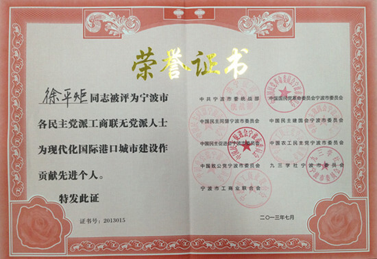 徐平炬董事長作為民建市委會委員、民建企業家協會常務副會長,與其他50人共同榮獲“寧波市各民主黨派工商聯無黨派人士為現代化國際港口城市建設作貢獻”先進個人稱號,并接受了大會表彰。近年來,徐平炬董事長帶領賽爾集團不懈努力,為寧波港口城市建設做出了重要貢獻: