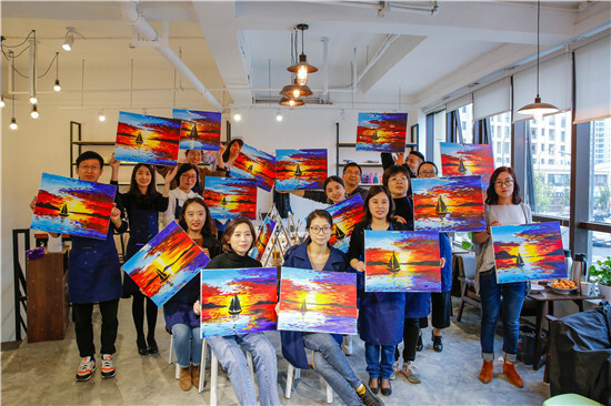 油畫一側(cè),畫架擺上,顏料備好,圍裙一系,專業(yè)的畫師模樣出來了!男老師畫畫真的比較罕見,這細致活需要耐心。經(jīng)過近2個小時的創(chuàng)作,一副副油畫作品出來了,寧波講師統(tǒng)一創(chuàng)作了“海上帆船”,沒有對比就沒有傷害哦。義烏講師就各顯神通了:有爸爸和媽媽和女兒一起創(chuàng)作的最紅社會人“小豬佩奇”;有自創(chuàng)作品“書香四溢”,出自桂東東老師之手,簡約卻不失神韻哦!
