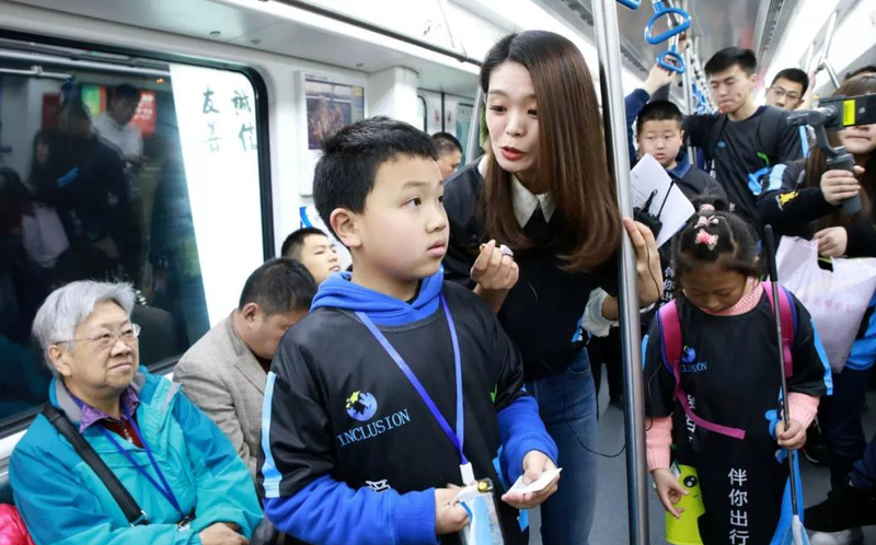 上午9點,賽爾志愿者在澤民地鐵站與星寶家庭匯合,在直播主持人帶領下,向群眾宣傳自閉癥和無障礙出行的相關知識,并協(xié)助星寶乘上地鐵,幫助他們順利抵達四明中學運動場。