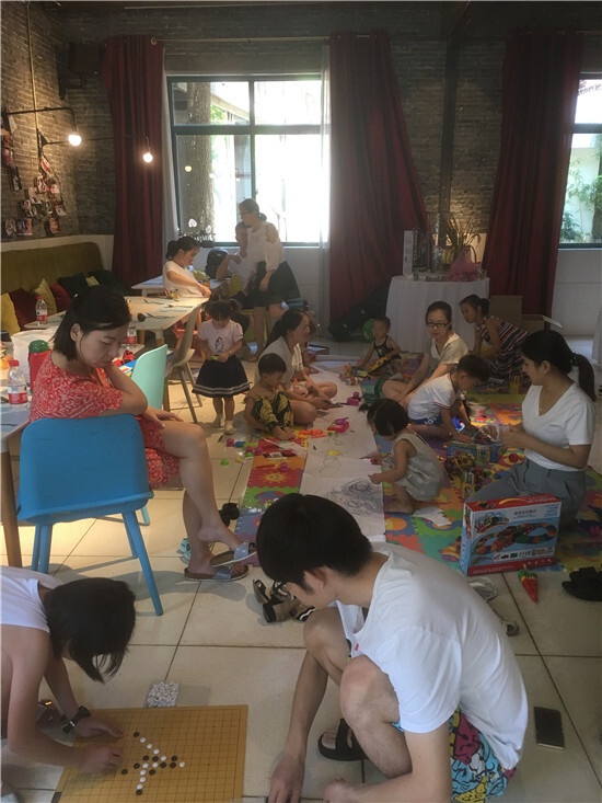 8月4日,天氣晴朗,優(yōu)景公司第一屆親子活動在大步里院拉開了序幕。共有13組家庭報(bào)名參加,其中3-5歲的寶貝居多。早上9點(diǎn)半,大家陸續(xù)來到大步里院,孩子們一看見我們?yōu)樗麄兙臏?zhǔn)備的畫板、水彩筆、印章等玩具,都迫不及待地脫掉鞋子,來到EVA墊子上,歡快地玩耍起來。