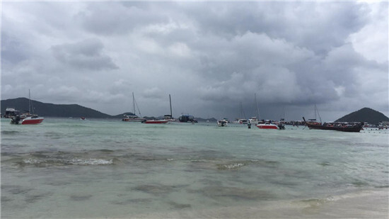 海島的天氣變幻莫測(cè),已早有耳聞,可當(dāng)真正經(jīng)歷過才覺得有些不可思議,早上艷陽高照,可中午就傾盆大雨,更不可思議的是在目力所及的同一片天空下,竟然這半邊天是烏云籠罩,狂風(fēng)驟雨,而遠(yuǎn)處只是多云卻也晴好!突然而至的暴雨,加上較快的船行速度讓我們?cè)谒查g濕身,狹小的船艙頂部雖有窄長的遮陽的頂棚,可絲毫不擋雨,大家又濕又冷!