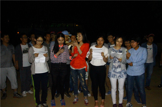 籃球賽結束后,迎來的是一頓菜多肉少、僧多粥少的晚餐,之后就是大家的自由活動時間了,在那風高黑夜,有人沿著山路找尋著傳說中的南北湖,有人干脆回房牛牛了,也有人玩起了殺人游戲。