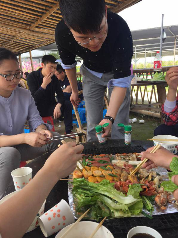 春游第一站是燒烤亭。面對已經擺放好的豐盛食材,大家早已迫不及待地各自組隊開動了。當然每組的搭配也是很奇妙的,總有那么幾個拿得出手的“廚神”,也總有那么幾個“吃貨擔當”。