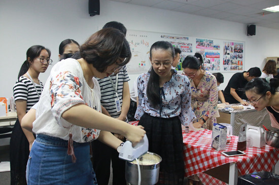 兩位講師首先為大家簡單地介紹了制作木糠杯的流程,演示的同時也分享了做木糠杯的小技巧,比如餅干屑是越細口感約好,奶油不能發得太硬……小伙伴們紛紛表示get了很多新知識。講師安排小組成員分工協作,一個打奶油,一個碎餅干,一個擠奶油,經過一個多小時的細心制作,大家的木糠杯都逐漸成型啦,雖然長相不一,但口感都是獨一無二,看上去就很好吃!