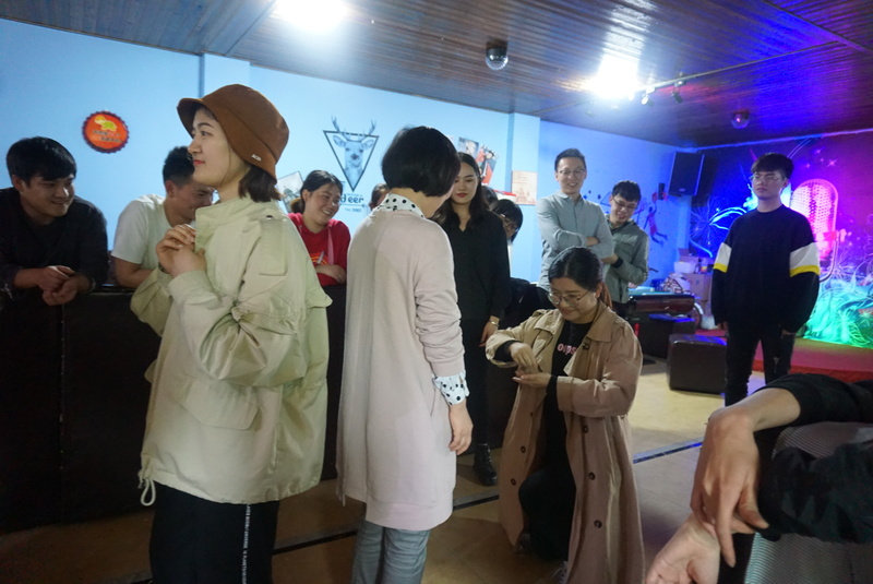 廚藝展示和午餐結(jié)束,大家在酒吧間休憩片刻后,玩起了“有口難言”的游戲:第一個人接收到策劃組的詞后只能通過肢體動作傳遞給下一個人,由最后一人猜詞。為了讓大家彼此間可以更加熟悉,我們進行了重新分組。每個組都會有一兩個游戲黑洞,讓原本很好猜到的詞語變得難度加倍,下一個成員也只能一臉懵逼地把動作接著傳遞,在局內(nèi)比劃的人確實是有口難言,但是旁觀的人早已捧腹大笑。