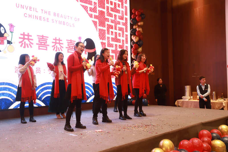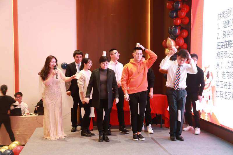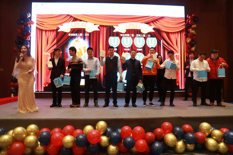 會議結(jié)束后,大家陸續(xù)到達晚宴地點。一進門,就看到兩位大財神正捧著金元寶在發(fā)入場紅包,場地的桌椅都鋪上了喜慶的大紅布,伴著《新春序曲》的音樂,年會的熱鬧勁兒撲面而來。晚會上,小人舞、3D游戲、抖乒乓球比賽、熒光舞、驚喜環(huán)節(jié)、相聲合唱不一而足,頗具新意。當然晚會也少不了各種抽獎活動,幸運大屏滾動,每個小伙伴彼時都希望自己成為幸運的錦鯉,而不定時的搶紅包環(huán)節(jié)更是讓現(xiàn)場伴隨著陣陣尖叫。