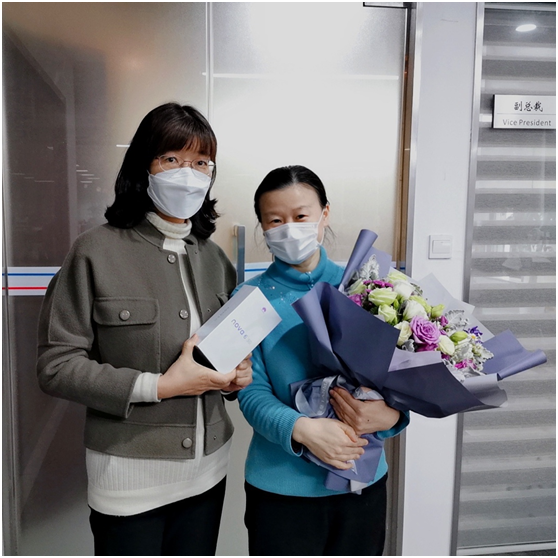 為感謝小廖姐的先生為財務統計工作所做出的貢獻,彩姐特別將財務部的創新基金以其先生的名義送出這份女神節超級大禮。小廖姐從彩姐手中接過鮮花和華為NOVA6 5G手機,沉浸在這突如其來的幸福和喜悅中……