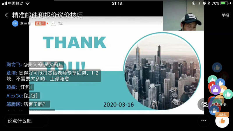 3月21日,賽爾學院終于迎來了第一節直播課程《精準郵件和報價議價技巧》。開課之前,講師依次點名。課堂上,講師時而進行互動、時而分享小故事,同學們都積極回應,踴躍表達自己的看法,成功帶動了課堂氛圍。同時,也有很多同學給講師直播打賞,打賞金額雖然不大,但對講師卻是莫大的肯定與鼓勵。