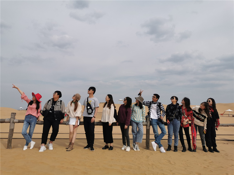 廣闊無垠、黃沙漫天的鄂爾多斯響沙灣中闖入了千姿百態(tài)的駱駝,讓整副畫卷生動起來。眼前一排排一列列的駝峰緩緩移動著,一瞬間恍如穿越回公元前的絲綢之路,沙地旁馬達轟鳴的四驅(qū)車又把思緒拉回了現(xiàn)實。