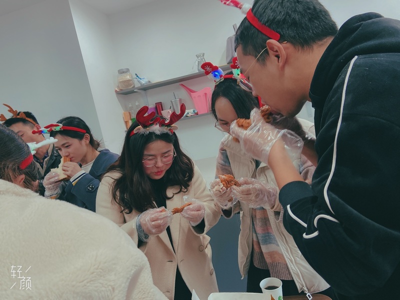 為了舒緩大家緊張的工作氣氛,優訊四部在圣誕節這一天策劃了“德智體”全面發展的圣誕比拼小游戲。在第一輪的“吃雞大戰”,每組必須在最短時間內暴風吸入一只炸雞,此時的男士們充分展現了自己的優勢。