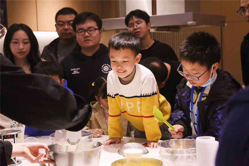 大伙兒滿懷期待,早早地到達集合地。在蛋糕師一輪耐心的實操教學后,大家迫不及待來到廚臺前進入DIY環節!平時在行行代碼間修正bug的IT小哥哥們,穿上圍裙后搖身成為米其林糕點師。60克牛奶,60克白糖,60克低粉,6個雞蛋…若干材料混合在一起,變化為面包坯原料。蛋糕制作中最重要也是最難的步驟是將蛋黃制作成蛋糊的乳化過程,但這也難不倒技術部的小哥哥小姐姐們,發揮理工科對精確性的把握,打蛋機手法和對時間的把控令人嘖嘖稱奇,不一會兒蛋糊就變得濃郁綿密,指導老師也對大家的成果贊不絕口??鞠渖舷?75度,烘培20分鐘,一塊塊香噴噴的面包坯就烤制完成,金黃色的蛋糕早就讓小朋友們都垂涎三尺。最后,奶油和水果粒組合定型,蛋糕完成。