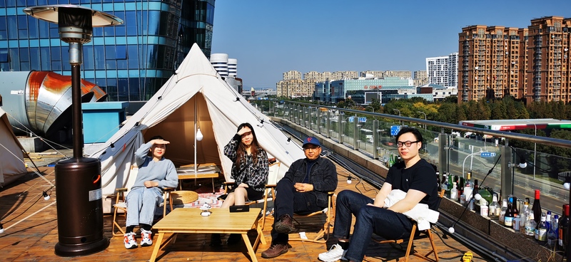 寧波招聘組組織了一場別開生面的天臺露營活動。大家分工合作、協同配合,在大廚們的努力下,一串串香氣撲鼻的烤串端上餐桌。邊吃邊聊中,各自加深了彼此的了解。夕陽微醺,組里的麥霸一展歌喉,引來不少觀眾喝彩;躺在椅上曬太陽小憩反倒也很樂哉。狼人殺游戲更是將活動的氣氛推向高潮,大家想辦法把對立方殺得片甲不留,天空飄著大家歡快的笑聲。