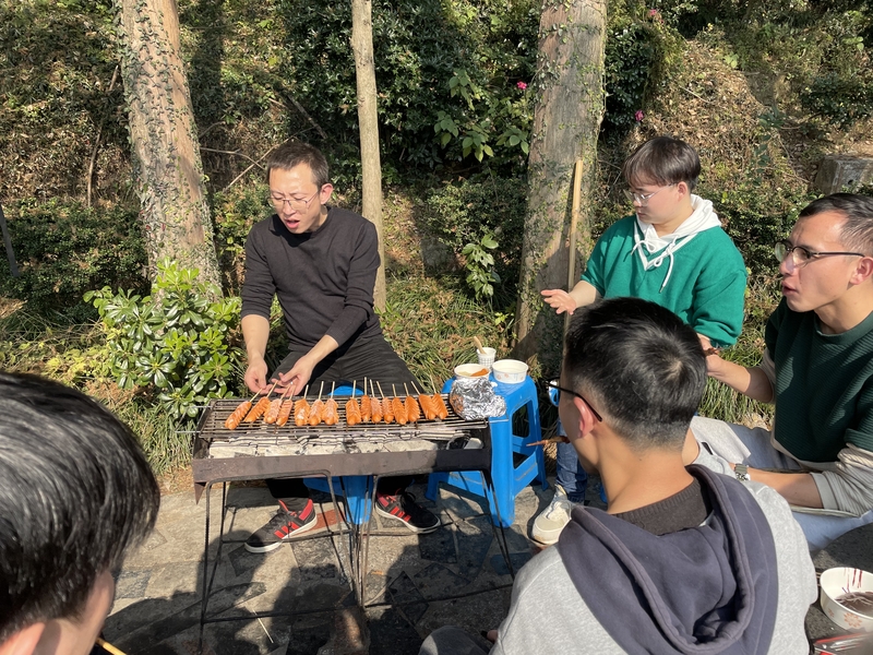 比賽結(jié)束后,大家在湖邊落座,冬日暖陽(yáng)下,大伙兒互相分享零食、制作美味燒烤。新老同事打成一片,侃侃而談,甚是融洽。吃飽喝足后,策劃組還特別準(zhǔn)備了諸多有趣的團(tuán)隊(duì)小游戲,比如,跳大繩、群龍取水、蒙眼互打、你比劃我猜......各種互動(dòng)小游戲讓大家重拾童趣,施壓解乏,小組成員間的配合也十分默契。不知不覺中已夕陽(yáng)西下,我們肆意盡興,一天的團(tuán)建輕松愉悅,所有人都還意猶未盡。