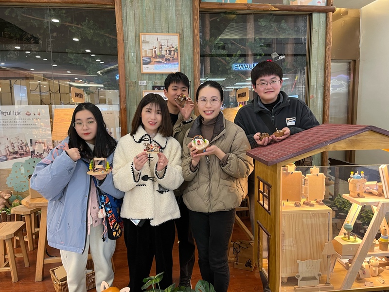 當天下午,伙伴們前往“WOODERFULLIFE”進行木藝DIY。店面門口的木藝展品柜十分招人眼球,精致而又可愛的木雕把我們帶進了童話世界:小王子手捧玫瑰陪著他的貓;圣誕老人騎著他的麋鹿送來禮物;還有莫名呆萌、不停翻跟頭的大猩猩。小小的八音盒,隨著音樂轉動,帶走我們的煩惱。進店挑選了自己心儀的配件,組裝成了精美的收納盒和擺件,它們有的是媽媽送給女兒的小驚喜,有的是兒子給媽媽準備的生日禮物。每個小物件都寄托著自己的心意,或許生活就是需要這樣的點綴才會熠熠閃光吧。