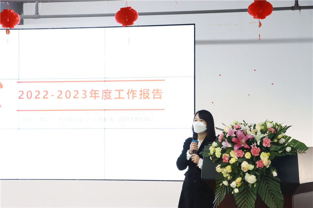 首先,副總經(jīng)理黃麗作年度業(yè)績匯報。黃麗總肯定了全體同事的工作成果,2022年是受疫情和俄烏戰(zhàn)爭雙重影響的一年,在嚴(yán)峻的外貿(mào)大環(huán)境背景下,很多行業(yè)都受到了不同程度的沖擊,特別是對我們外貿(mào)行業(yè)的影響更是巨大的。但是優(yōu)屹全體同事心往一處想,勁往一處使,在大家的共同努力下順利完成了考核目標(biāo)。隨后,黃麗總就2023年提出,2023年的工作重心為持續(xù)開發(fā)、用心維護(hù)、緊抓增量,為來年的工作開展指明了方向。