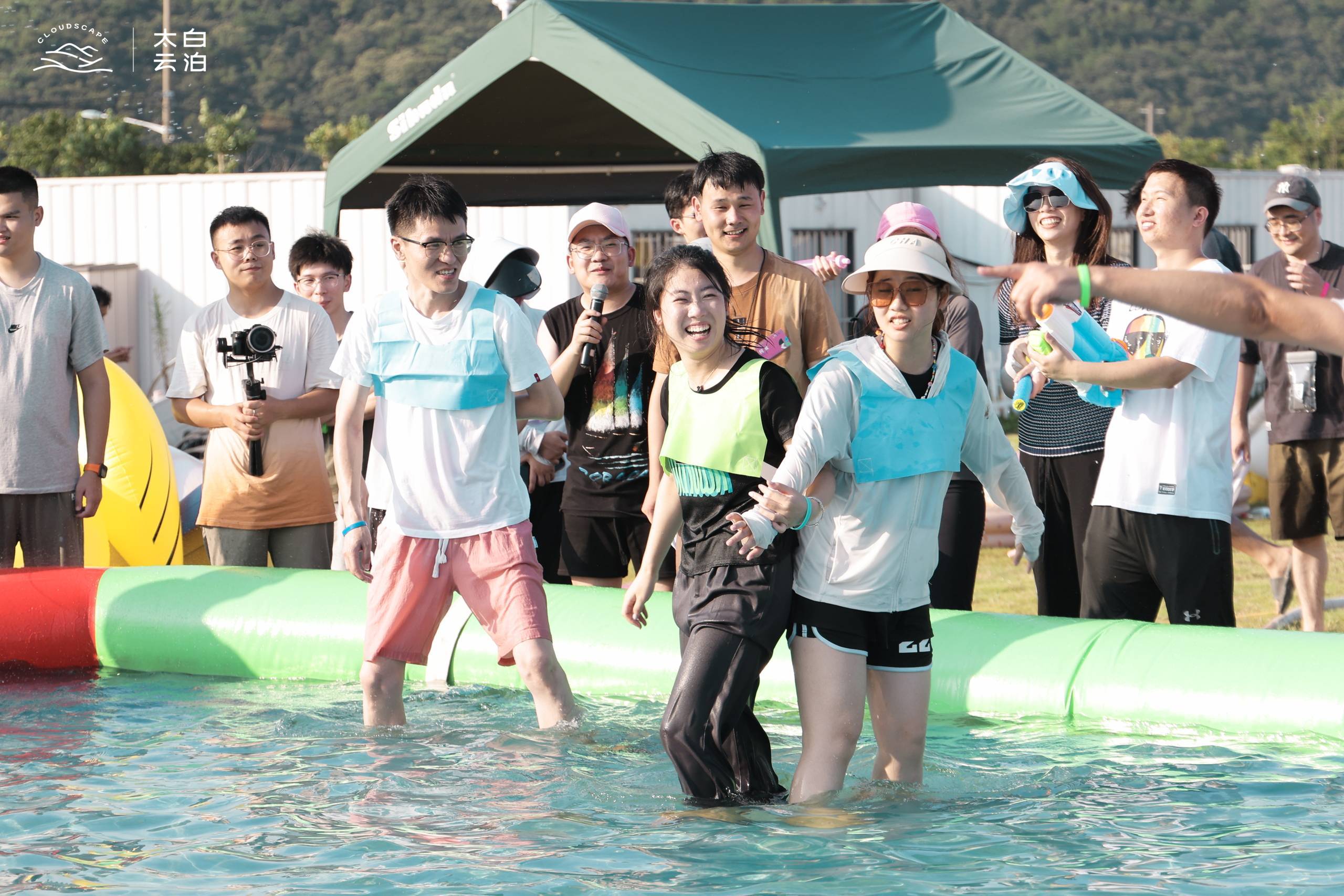 雖已過“立秋”,天氣依舊潮濕悶熱。午飯過后,我們紛紛坐上了前往咸祥航空營地的大巴。抵達目的后,各個部門換上不同的粉色T恤一起拍了合照。隨后,本次團建正式開始。本次團建分為游戲環節和音樂晚會兩大部分,游戲環節有蒙眼倒水、水上接力、水上撕名牌、潑水大戰、水上拔河、冰桶挑戰等六項游戲和最后一項打破所有規則的終極大亂斗。十支隊伍在各自隊長的排兵布陣下展開了愉快又激烈的交鋒。游戲中大家所展現的昂揚激情和默契配合也是優景員工上半年工作中協同奮斗、團結拼搏的縮影。