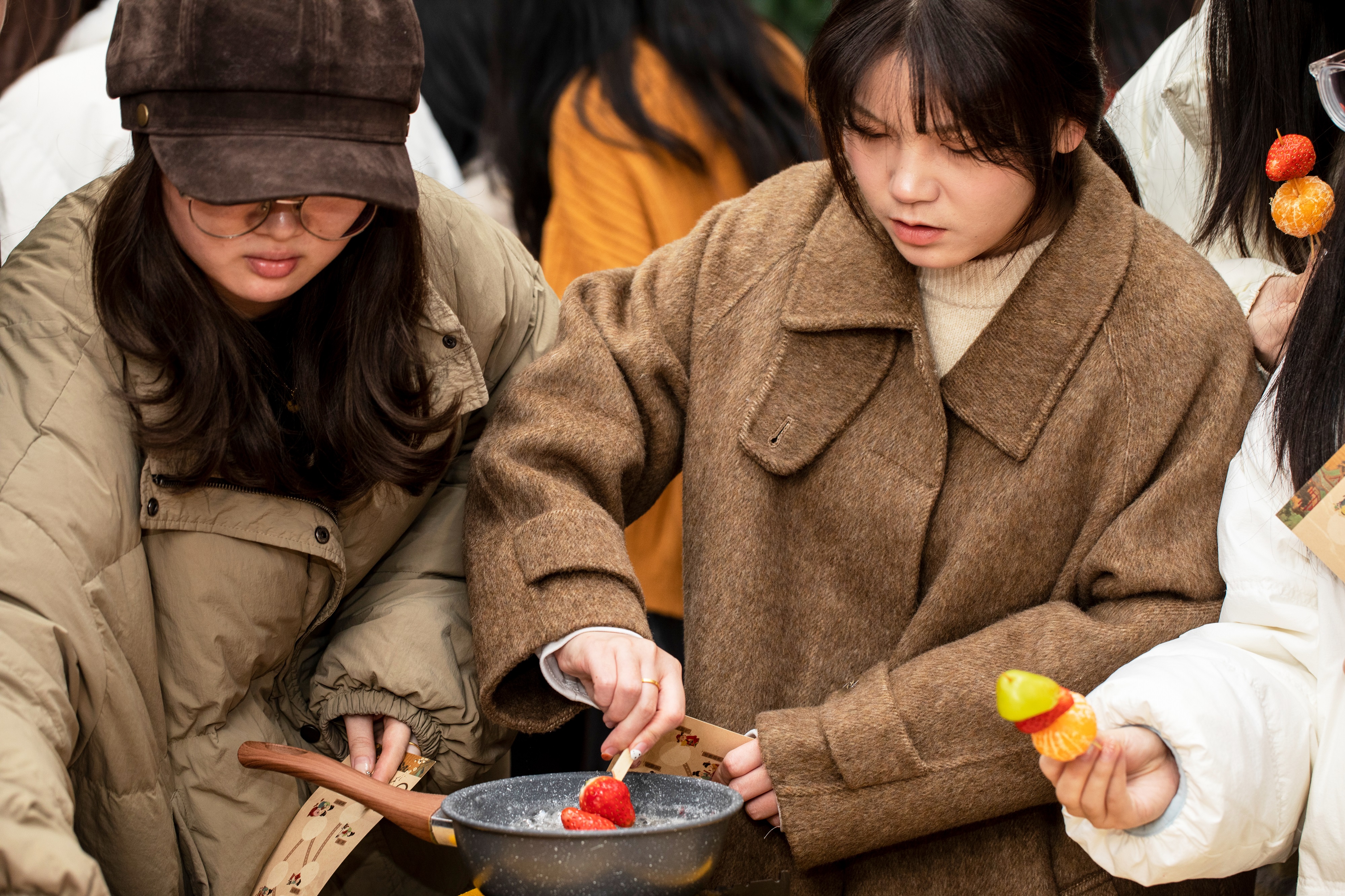 賽爾大廈1F大廳里,布置有做燈籠、做冰糖葫蘆、拓畫三個攤位,每張桌子前都人頭攢動,不時傳來熬糖的香甜和完成制作的歡呼。做燈籠的難度最大,雖然有詳細的步驟說明,但還是極大地考驗大家的耐心與協(xié)調(diào),不過完成后的成就感當(dāng)然也是無與倫比的;拓畫看似簡單,卻也隱藏著技巧、考察了審美,需要少量多次、力道均勻地按壓顏料,才能在扇子、拓片上印下圖案;糖葫蘆的制作輕松有趣得多,選好水果,放入糖漿中熬煮,適時提起,等待冷卻,即可享用美味。
