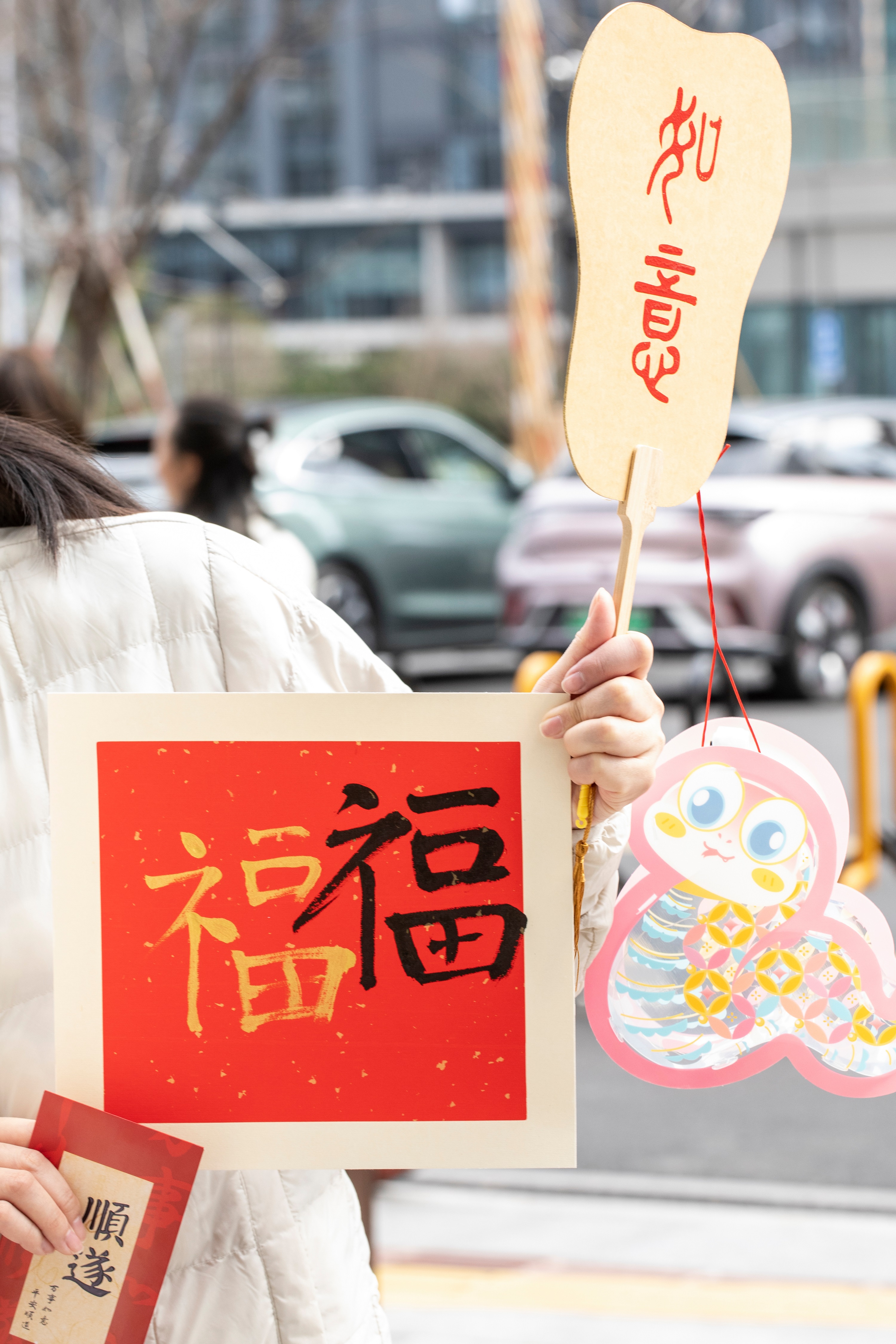 出門來到1F培訓(xùn)室,還可以繼續(xù)體驗剪窗花、寫福字、做燈籠。窗花攤位上有各種可愛又難度不一的剪紙,配有剪刀、膠水、刻刀,耐心完成后把窗花粘在背景板上,給今年家里過年增添一件裝飾品;寫福字時,有循規(guī)蹈矩寫“福”的,有發(fā)揮創(chuàng)意,又寫又畫,把蛇形與福字相結(jié)合,也有揮毫潑墨,一展風(fēng)采,引得眾人驚嘆連連;燈籠攤位上可不止能做燈籠,中國結(jié)、福字、柿子、扭扭蛇,甚至是薯條,都能在大家的集思廣益下完成。