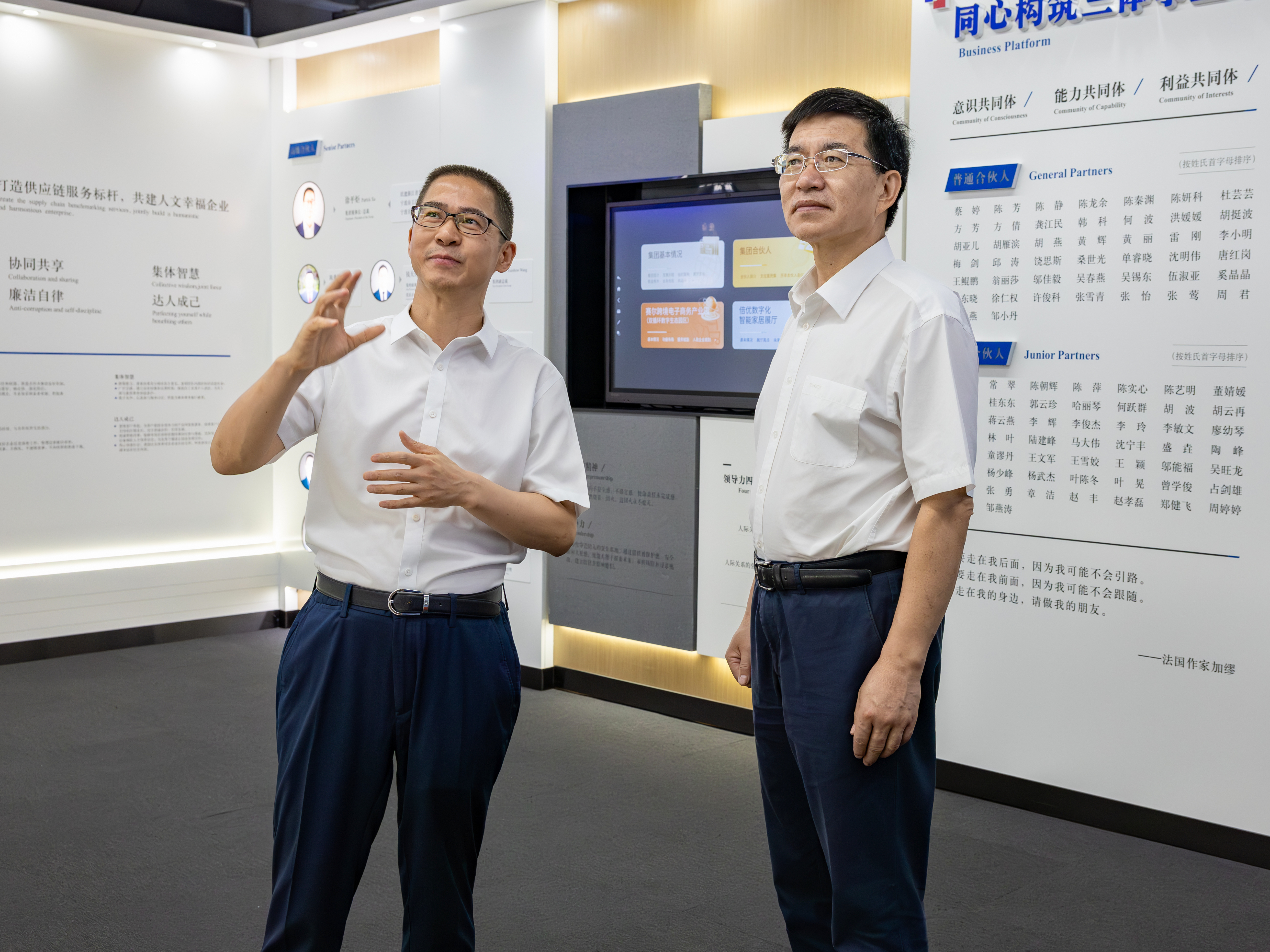陳龍主席一行首先參觀集團企業(yè)文化展廳,詳細了解集團自1997年創(chuàng)立以來的發(fā)展歷程、業(yè)務創(chuàng)新升級及企業(yè)文化建設成果,對集團在日用消費品進出口領域取得的良好業(yè)績及高質量發(fā)展予以高度評價。