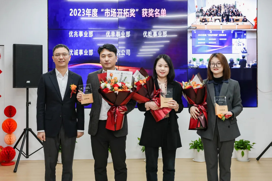 會議舉行年度重要獎項頒獎儀式。23年度集團設立集體獎項7個,優景公司榮獲文化建設獎和學習組織獎,優騰公司榮獲協同共享獎和清廉建設獎,優越公司榮獲創新活力獎,優遠公司榮獲人才磁石獎,集團單證風控部榮獲信息安全獎。23年集團設立團隊獎項6個,分別是藍海戰略獎、市場開拓獎、業績倍增獎、業務質量獎、網絡營銷獎和客戶服務獎,共有21個業務團隊獲得獎項榮譽。藍海戰略獎由優勝公司和優訊公司獲得,該獎項要求對新業態模式敏感,業務布局前瞻性強,有示范性新項目落地成功,公司業務布局成為集團重要業務賽道之一,陳勇珍和錢天鋒分別代表各自公司領取藍海戰略獎,所獲榮譽實至名歸。23年度陳勇珍、錢天鋒、王建、徐生科等四位業務總經理獲得個人獎項的最高榮譽金鼎獎,該獎項歷來以競爭激烈著稱,四位獲獎者憑借著業務規模、高速增長和盈利能力摘得金鼎桂冠。2023年度共有20位業務負責人憑借部門優秀業績,榮獲個人金牛獎項并現場上臺領獎。