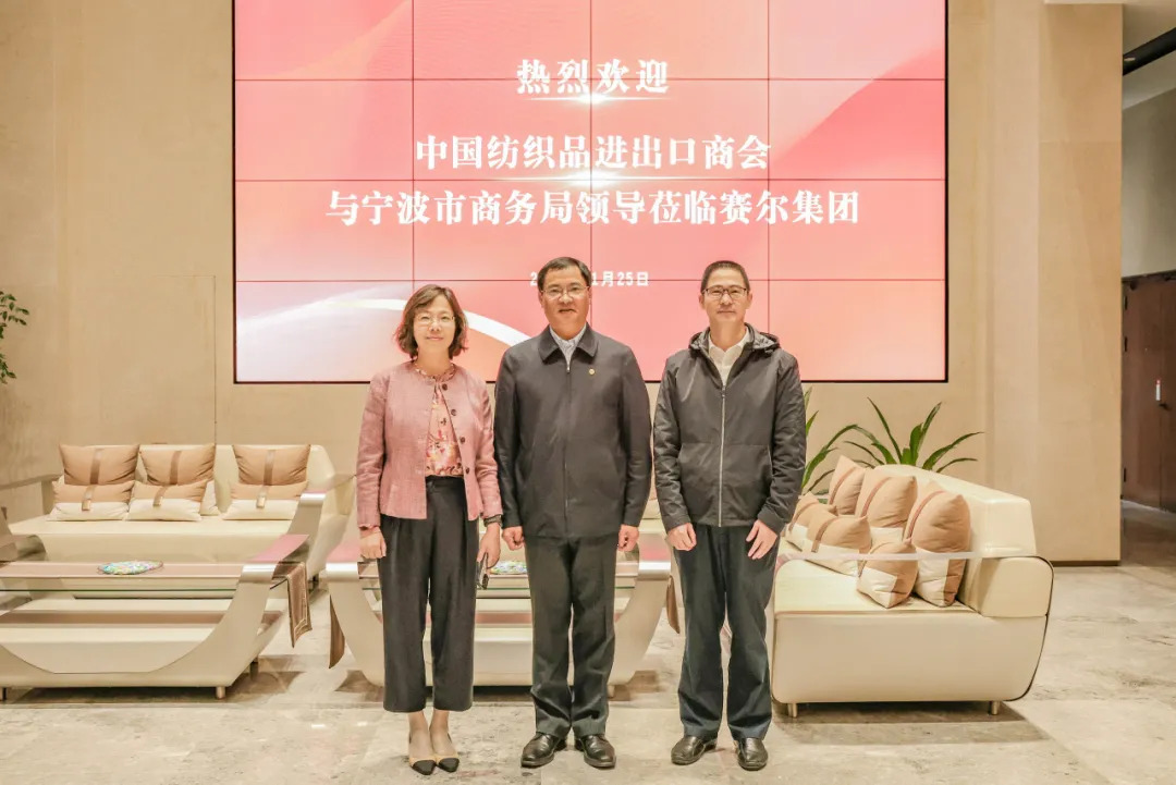 11月25日下午,中國紡織品進出口商會曹甲昌會長、會員部副主任苗青芳等一行來賽爾集團走訪調研。寧波市商務局黨組副書記、副局長、二級巡視員韓雋、市商務局貿促處處長張陽松、貿促處副處長馬建萍等陪同調研,賽爾集團董事長徐平炬、副董事長聯席總裁陳勇珍、總裁助理馬科成、集團行政副總經理方芳、優勝公司副總經理張怡和業務副總監胡穎等熱情接待。